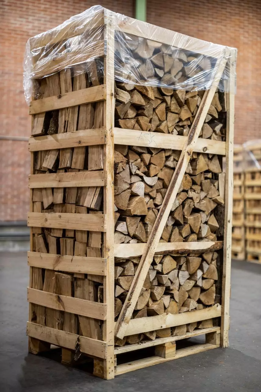 Fylder ca. 1,8 m3 tæt stablet på engangspalle (udvendige mål). Savet i max 25 cm og kløvet.